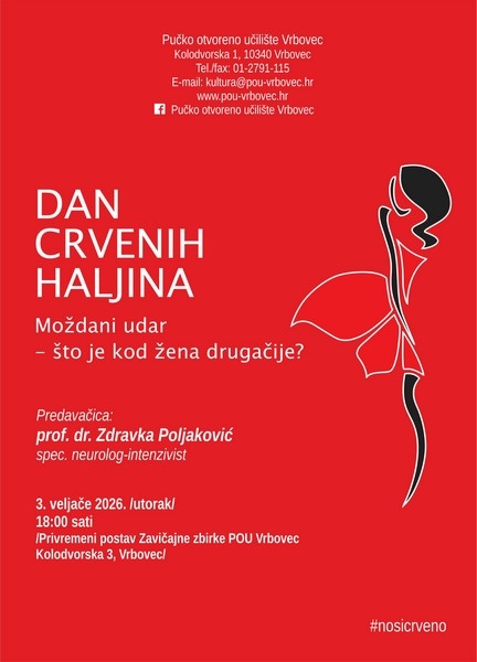 Pozivamo vas na predavanje dr. Zdravke Poljaković pod naslovom Moždani udar - zšto je kod žena drugaćije? koje će, u povodu Dana crvenih haljina, javnozdravstvene kampanje posvećene prevenciji moždanog udara u žena, održati u utorak, 3. veljače 2026. od 18:00 sati u privremenom postavu naše Zavičajne zbirke, Kolodvorska 3. Kampanja ima za cilj potaknuti žene da se brinu o svom zdravlju, prvenstveno zdravlju srca i krvnih žila, jer je većinu tih bolesti moguće spriječiti zdravim životnim navikama. Isto tako želi potaknuti stručnjake u zdravstvu da obrate posebnu pozornost na srčani i moždani udar kod žena, zbog njihovih razlika u odnosu na muškarce.