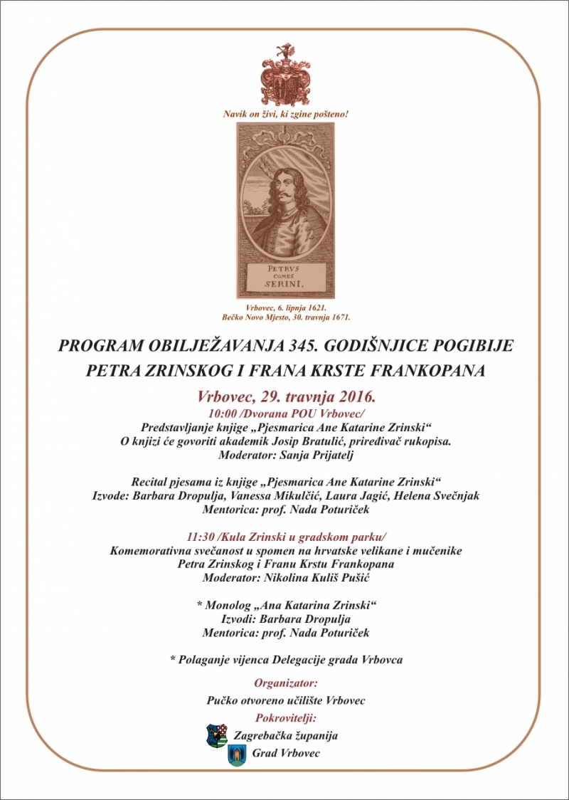 U spomen na hrvatske velikane Petra Zrinskog i Frana Krstu Frankopana, pogubljene 30. travnja 1671. godine u Bečkom Novom Mestu, Pučko otvoreno učilište Vrbovec u petak, 29. travnja 2016. organizira niz događanja.