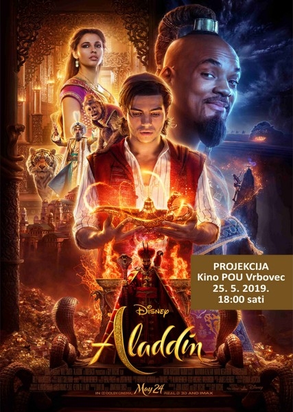 Sutra, u subotu 25. svibnja 2019. u 18:00 sati u našem kinu pogledajte sinhronizirani igrani film Aladdin. Talentirani redatelj Guy Ritchie donosi nam romantičnu i glazbenu avanturu smještenu u fiktivni lučki grad Agrabah. U glavnim ulogama nalaze se duh koji se pojavljuje iz čarobne svjetiljke (Will Smith), šarmantna bitanga Aladin (Mena Massoud) te Jasmina (Naomi Scott), skromna i odlučna princeza slobodnog duha. Njihovoj pustolovini pridružuju se i magični čarobnjak Jafar, Sultan koji je zabrinut za dobrobit i budućnost svoje kćeri Jasmine, Jasminina najbolja prijateljica Dalia, zgodni i arogantni udvarač Princ Anders i Haskim kao Jafarov prvi pomoćnik i kapetan straže.