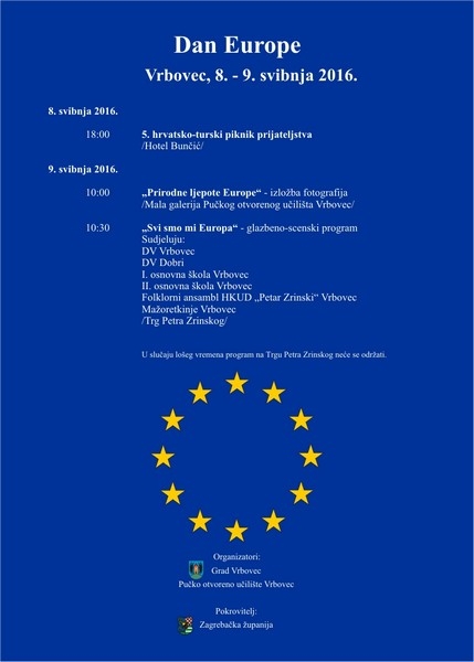 U povodu Dana Europe Grad Vrbovec i Pučko otvoreno učilište Vrbovec organiziraju glazbeno-plesni program "Svi smo mi Europa" koji će se održati na Trgu Petra Zrinskog u ponedjeljak, 9. svibnja 2016. u 10:00 sati. U programu sudjeluju Mažoretkinje Vrbovec, HKUD "Petar Zrinski" Vrbovec, I. i II. Osnovna škola Vrbovec te Dječji vrtić Vrbovec i Dječji vrtić Dobri. U sklopu obilježavanja Dana Europe, dan ranije, u nedjelju, 8. svibnja 2016. u Hotelu Bunčić održava se 5. hrvatsko-turski piknik prijateljstva.