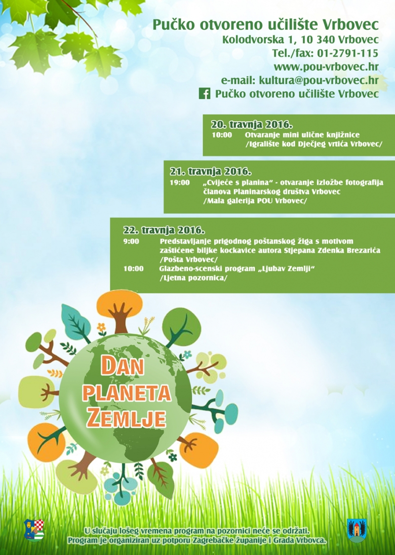 I ove godine Pučko otvoreno učilište Vrbovec pripremilo je niz programa kojima se želi upozoriti na važnost zaštite okoliša i prirodnih bogatstava koje mi kao društvo trebamo očuvati za sljedeće generacije. Prvi u nizu programa jest otvaranje mini knjižnice na prostoru dječjeg igrališta preko puta Dječjeg vrtića Vrbovec, u srijedu, 20. travnja 2016. u 10:00 sati. Program se nastavlja u četvrtak, 21. travnja 2016. otvaranjem izložbe fotografija članova Planinarskog društva Vrbovec u Maloj galeriji Pučkog otvorenog učilišta, s početkom u 19:00 sati.