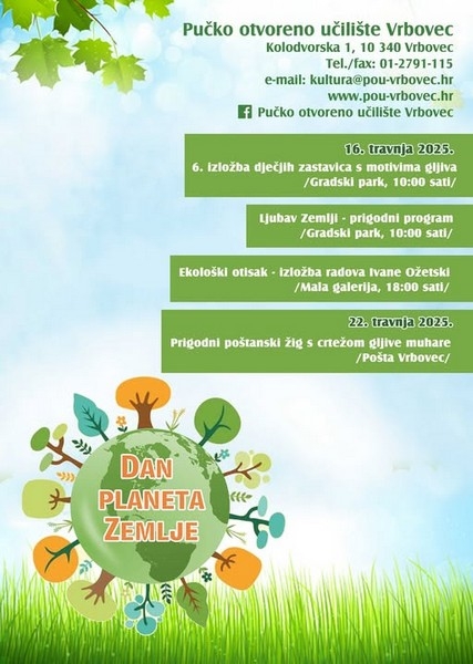 U povodu Dana planeta Zemlje, 22. travnja, održat ćemo nekoliko događanja. U utorak, 15. travnja 2025. u našoj dvorani Natalija Šustek održat će predvanje pod nazivom Priroda kao poticaj učenja i razvoja djeteta. U Gradskom parku ćemo 16. travnja 2025. u 10:00 sati otvoriti 6. izložbu dječjih zastavica koje su izradila djeca vrbovečkih vrtića i škola, a na temu gljiva. Bit će održan i prigodan glazbeno-poetski program.