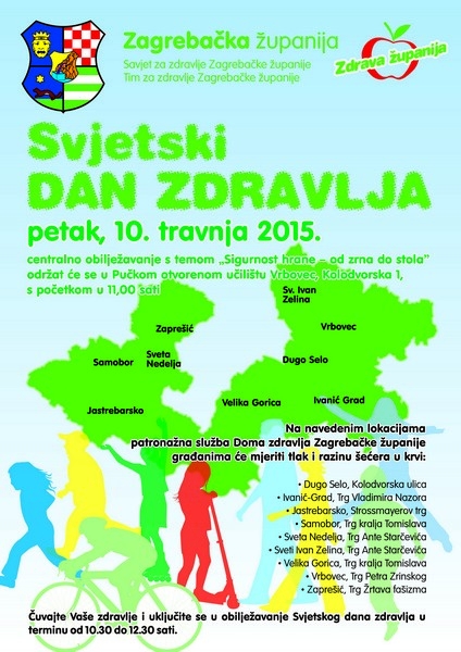 U Pučkom otvorenom učilištu Vrbovec u petak, 10. travnja 2015. s početkom u 11:00 sati bit će održano centralno obilježavanje Svjetskog dana zdravlja u Zagrebačkoj županiji. Tom prigodom će mikrobiologinja Ružica Cipriš održati predavanje na temu „Sigurnost hrane“. Ksenija Piršljin s ekološkog imanja „Zrno-eko“ iz Habjanovca prezentirat će način proizvodnje zdrave hrane „Od zrna do stola“.