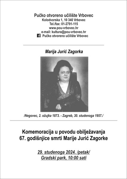 U povodu 67. godišnjice smrti Marije Jurić Zagorke, književnice i naše prve novinarke, koja je preminula 30. studenoga 1957. godine u Zagrebu, sutra, u petak, 29. studenoga 2024. godine u 10:00 bit će održana komemoracija uz Zagorkinu bistu u gradskom parku. Cvijeće će položiti te zapaliti svijeće delegacija Grada Vrbovca, ravnateljica POU Vrbovec Sanja Prijatelj, ravnateljica OŠ Marije Jurić Zagorke Edina Operta, ravnatelj OŠ Krunoslava Kutena te učenička delegacija. Povijesni osvrt na život i rad Marije Jurić Zagorke dat će Lidija Kuserbanj.