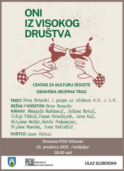 U sklopu adventskog programa u našoj dvorani 21. prosinca 2025. od 18:00 sati gostovat će amaterska kazališna skupina Trag Centra za kulturu Sesvete. Izvest će predstavu Oni iz visokog društva u režiji Dore Borecki. Predstava nas vraća u Zagreb 60-ih godina 20. stoljeća. Šestero mladih i tri starije gospođe. Spontano dogovaranje braka postaje splet zabluda i neočekivanih ishoda kada mladi odluče uzeti stvar u svoje ruke. Tko od njih (ni)je iz visokog društva?