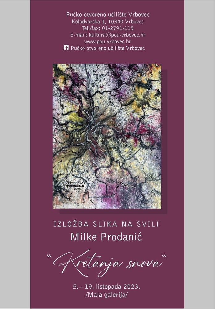 Pozivamo vas na otvaranje izložbe slika Milke Prodanić, povjesničarke umjetnosti i profesorice povijesti te dugogodišnje slikarice na svili koja živi i radi u Garešnici. Tijekom tri desetljeća stvaranja, istraživanja tehnologije i izlaganja na više od četrdeset izložbi, obogatila je svoj umjetnički izraz te danas suvereno vlada tehnikom slikanja na svili koju je usavršila stvorivši vlastiti stil. Izložbu ćemo otvoriti sutra, u četvrtak, 5. listopada 2023. od 19:00 sati našoj Maloj galeriji.