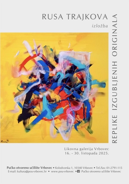 Replike izgubljenih originala naziv je izložbe Ruse Trajkove koju ćemo otvoriti ovoga četvrtka, 16. listopada 2025. godine od 18:00 sati u Likovnoj galeriji Vrbovec. U katalogu izložbe Iva Körbler je zapisala: Pred nama su iznimno koloristički snažne likovne kompozicije, u kojima Rusa Trajkova pokazuje kako je ne samo vrsna koloristica, već teži za traganjem i rješavanjem unutrašnjih, strukturalnih, kompozicijskih problema dvodimenzionalnog predloška slike. Zanimaju ju žestoki, pulsirajući sudari toplih i hladnih boja, gesti, linija i vrpčastih kovitlaca; iluzija dubine, odnosno, kretanja prema naprijed i prema središtu slike u dubinu, kao čisto iskustvo slobodnog procesa slikanja.