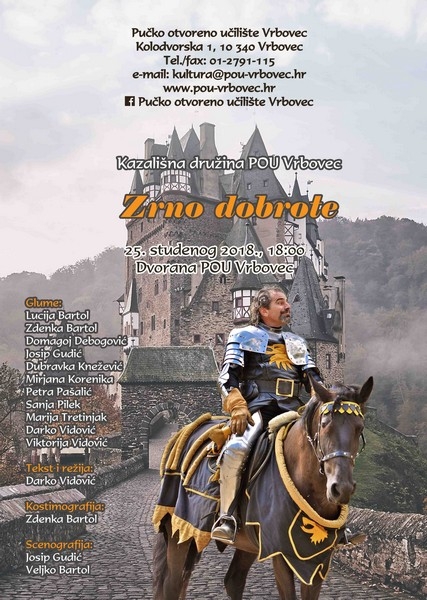 A što je dalje bilo saznajte gledajući predstavu Zrno dobrote u izvedbi Kazališne amaterske družine POU Vrbovec. Predstava će biti odigrana u nedjelju, 25. studenoga 2018. u 18:00 sati. Režiju potpisuje Darko Vidović koji je i autor teksta te jedan od glumaca. Uz njega još glume: Domagoj Debogović, Zdenka Bartol, Lucija Bartol, Mirjana Korenika, Dubravka Knežević, Josip Gudić, Sanja Pilek, Marija Tretinjak, Viktorija Vidović i Petra Pašalić. Kostimografiju potpisuje Zdenka Bartol, a scenografiju Josip Gudić i Veljko Bartol.