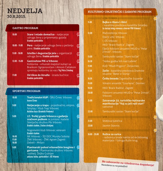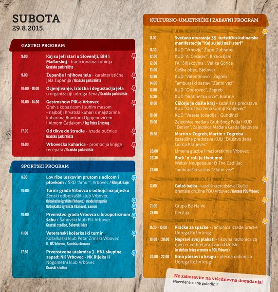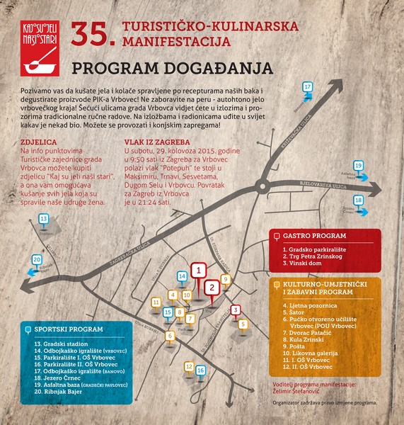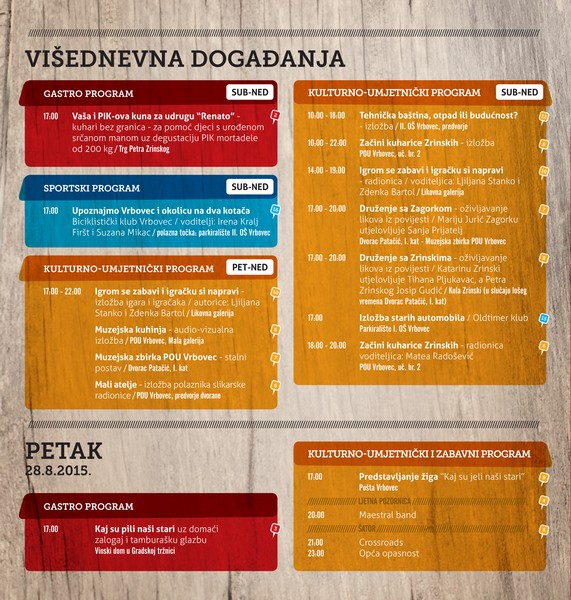 Kraj kolovoza u Vrbovcu tradicionalno će obilježiti turističko-kulinarska manifestacija "Kaj su jeli naši stari" koja će se održati od 28. do 30. kolovoza 2015. godine. Tijekom manifestacije posjetitelji će moći degustirati jela iz tradicionalne kuhinje, posjetiti izložbe, sudjelovati u radionicama za djecu i odrasle te pogledati nastupe kulturno-umjetničkih društava, kazališne predstave, sportska natjecanja, izložbu starih automobila, družiti se s povijesnim ličnostima i voziti konjskim zapregama.