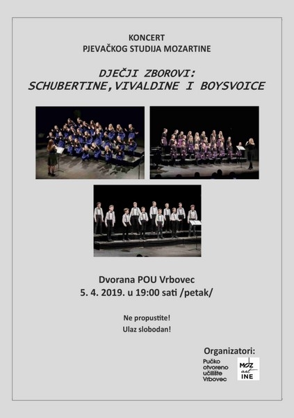 Pridružite se koncertu zborova djevojčica Schubertine i Vivaldine te zbora dječaka BoysVoice Studija Mozartine koji će se održati ovoga petka, 5. travnja 2019. u 19:00 sati u našoj dvorani. Zborovima će dirigirati Martina Divjak i Mateja Škaro, a korepetitorica je Virna Kljaković. Najstariji zbor ovoga studija je dječji zbor Schubertine koji je osnovan u listopadu 2010. godine kao treći podmladak Djevojačkog zbora Mozartine. Okuplja djevojčice od 6 do 12 godina. Najčešće izvode skladbe klasične glazbe poznatih hrvatskih i inozemnih skladatelja koje su primjerene dobi djece.