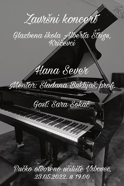 Pozivamo vas na završni koncert Hane Sever, nekadašnje učenice naše osnovne glazbene škole, danas maturantice križevačke Glazbene škole Alberta Štrige. Koncert će se održati u ponedjeljak, 23. svibnja 2022. u 19:00 sati u našoj dvorani.