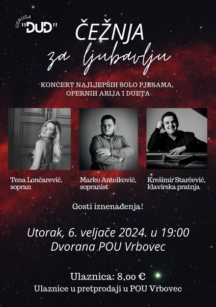 Čežnja za ljubavlju naziv je koncerta najljepših solo pjesama, opernih arija i dueta kojeg Udruga za promicanje kulture DUD iz Lonjice organizira povodom Valentinova. Koncert će se održati u utorak, 6. veljače s početkom u 19 sati u dvorani Pučkog otvorenog učilišta Vrbovec. Nastupit će sopranistica Tena Lončarević, sopranist Marko Antolković te Krešimir Starčević za klavirom, a na koncertu će im se pridružiti i gosti iznenađenja.
