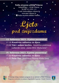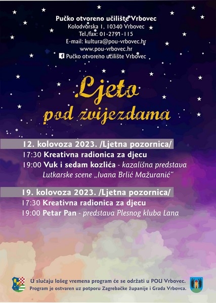 Ljeto pod zvijezdama naziv je programa koji uključuje likovne radionice, kazališne predstave i druge sadržaje koje ćemo održati na ljetnoj pozornici te uz pozornicu do kraja kolovoza mjeseca. Ove subote, 12. kolovoza 2023. u 17:00 sati i 30 minuta započet će likovna radionica za djecu od 3 godine nadalje. Bojat ćemo i crtati na temu bajke o vuku i 7 kozlića.