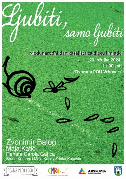 U povodu Međunarodnog dana kazališta za djecu i mlade u srijedu, 20. ožujka 2024. u 11:00 sati bit će održana kazališna predstava za djecu Ljubiti samo ljubiti Teatra Poco Loco. Pogledat ćemo priču o jednom pužu koji se zaljubljuje u djevojčicu Ružicu. Režija potpisuje Renata Carola Gatica, dramatizaciju Maja Katić prema tekstovima Zvonimira Baloga, autorica glazbe je Davorka Horvat, scenografiji i kostimografiju napravila je Jasmina Kosanović i Božidar Raos, a glume Bruno Kontrec i Maja Katić.