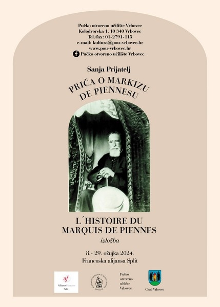 Večeras u 18:30 u Francuskoj alijansi Split bit će otvorena izložba Priča o markizu de Piennesu autorice Sanje Prijatelj koji je živio u Vrbovcu od 1879. do 1911. godine.