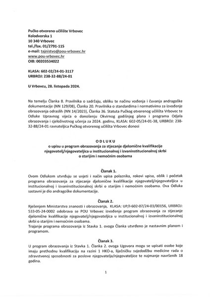 U tijeku su prijave i upisi za program edukacije za njegovateljice koji će se održati u našem učilištu tijekom narednih mjeseci. Program je uz vauere HZZ-a besplatan, a osobe koje ne udovoljavaju uvjetima za besplatnom edukacijom mogu same financirati svoje školovanje. Više informacija na telefon 01-2791-115 te adresu elektroničke pošte tajnistvo@pou-vrbovec.hr.