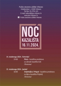 Noć kazališta je višednevna manifestacija koja prikazuje snagu i moć izvedbenih umjetnosti i bogatstvo kazališne djelatnosti u zemlji i na međunarodnom planu, a održava se svake treće subote u mjesecu studenom od 2008. godine. POU Vrbovec i ove se godine pridružuje Noći kazališta izvedbom kazališne predstave za odrasle Pluća kazališta Exit u kojoj glume Jadranka Đokić i Amar Bukvić. Predsrava će biti izvedena u čeetvrtak, 14. studenoga 2024. od 19:00 sati u našoj dvorani. Za djecu će biti izvedena predstava Smjehuljica i Mrgud kazališta Prijatelji, a glume Marijana Matoković i Hrvoje Zalar.
