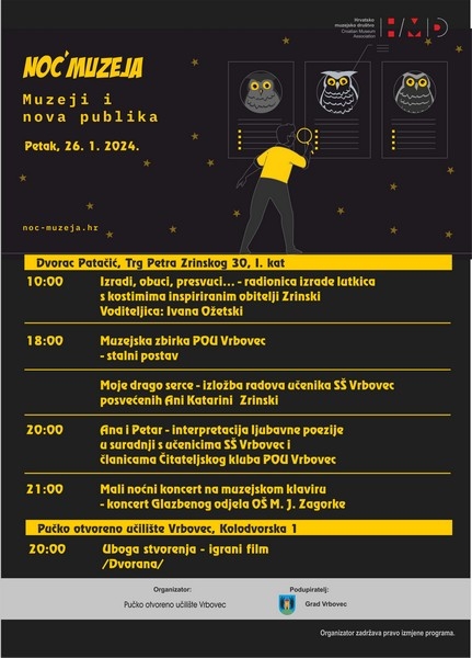 POU Vrbovec u sklopu Noći muzeja 2024. održat će radionice, čitanje poezije, koncert na muzejskom klaviru te izložbu u Muzeju u dvorcu Patačić gdje će se moći pogledati i stalni postav. Program će biti realiziran u u suradnji s DV Vrbovec, Srednjom školom Vrbovec, Glazbenim odjelom OŠ Marije Jurić Zagorke te Čitateljskim klubom POU Vrbovec. U dvorni učilišta bit će organizirana i projekcija filma Uboga stvorenja.