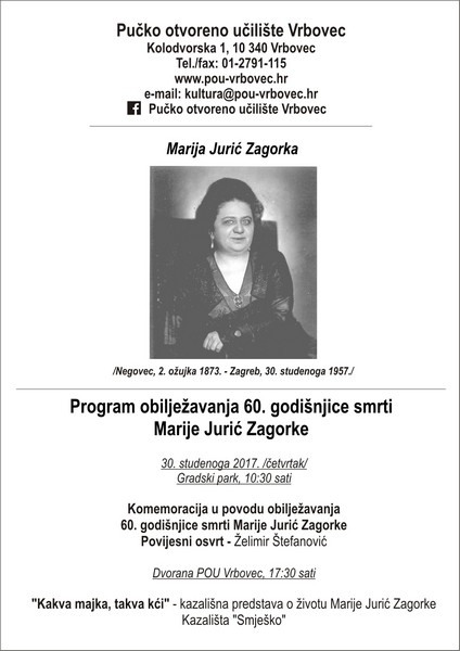 U povodu 60. godišnjice smrti Marije Jurić Zagorke, koja je preminula 30. studenoga 1957. godine u Zagrebu, Pučko otvoreno učilište Vrbovec organizira dva događanja. Ispred Zagorkine biste u gradskom parku 30. studenoga 2017. od 10:30 bit će održana komemoracija uz kraći povijesni osvrt o životu i radu najčitanije hrvatske književnice i naše prve novinarke koja je rođena 1873. godine u Negovcu nedaleko Vrbovca.