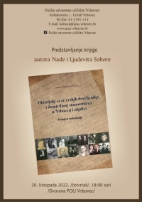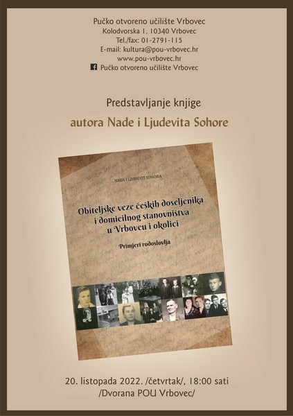 Predstavljanje knjige Obiteljske veze čeških doseljenika i domicilnog stanovništva u Vrbovcu i okolici autora Nade i Ljudevita Sohore bit će održano u četvrtak, 20. listopada 2022. godine u 18:00 sati u našoj dvorani. Knjiga donosi podatke o doseljavanju Čeha i Moravljana na naše područje koje je započelo u 16. stoljeću, a intenziviralo se u 19. stoljeću kada stiže i obitelj Sohora.