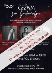Koncert Čežnja za ljubavlju u povodu Valentinniva otkazan je zbog bolesti izvođača. Novi termin je ponedjeljak, 19. veljače 2024. u 19:00 sati. Kupljene karte vrijede za novi termin koncerta, a ukoliko netko ipak želi povrat novca, javite se tijekom sljedećih dana na našu blagajnu.