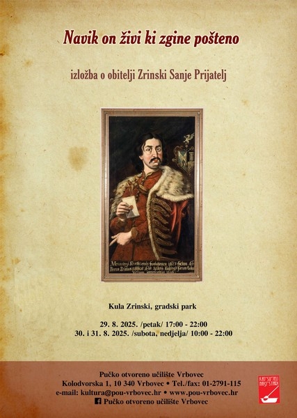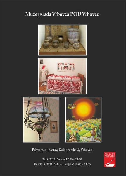 U našoj Maloj galeriji moći ćete pogledati izložbu slika Edit Glavurtić pod nazivom Skice iz Edena, u privremenom postavu našega muzeja na adresi Kolodvorska 3 moći ćete vidjeti muzejske zbirke, u novootvorenom izložbenom prostoru u Likovnoj galeriji Vrbovec bit će otvorena izložba Ljiljane Stanko i Zdenke Bartol pod nazivom Kaj su trebali i šteli, to su si opleli i spleli dok će u novoobnovljenoj kuli Zrinski biti otvorena izložba o obitelji Zrinski autorice Sanje Prijatelj.