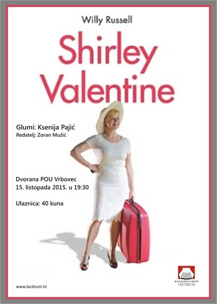 Kazalište Lectirum gostuje u Vrbovcu s predstavom „Shirley Valentine“ u četvrtak, 15. listopada 2015. godine u Dvorani Pučkog otvorenog učilišta Vrbovec s početkom u 19 sati i 30 minuta. U naslovnoj ulozi ove romantične monokomedije je Ksenija Pajić, a predstavu je režirao Zoran Mužić. Prema tekstu predstave koji je napisao Willy Russell snimljen je film, a tekst je uprizoren i kao mjuzikl koji je igrao na West Endu te na Broadwayu.