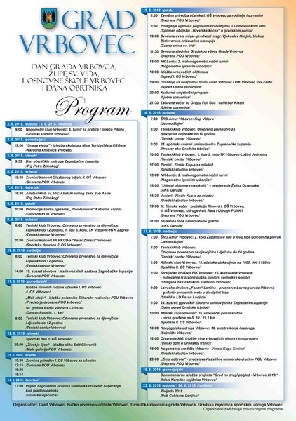 U povodu Dana grada Vrbovca, župe sv. Vida, I. osnovne škole Vrbovec i Dana obrtnika bit će organiziran višednevni kulturni, zabavni i sportski program koji će se održavati od danas pa sve do 16. lipnja 2018. godine. Organizatori programa su: Grad Vrbovec, Pučko otvoreno učilište Vrbovec, Turistička zajednica grada Vrbovca i Gradska zajednica sportskih udruga Vrbovec.