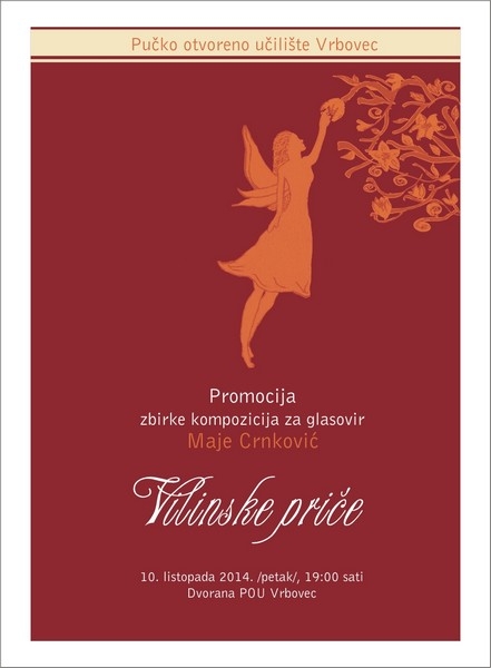 "Vilinske priče", zbirka kompozicija za glasovir pijanistice i kompozitorice Maje Crnković, bit će predstavljena u dvorani Pučkog otvorenog učilišta Vrbovec u petak, 10. listopada 2014. godine u 19:00 sati.