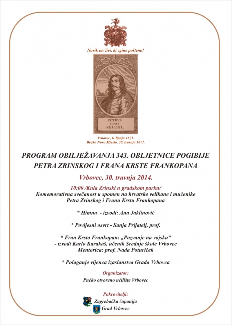 U povodu 343. godišnjice pogubljenja Petra Zrinskog i Frana Krste Frankopana, u srijedu, 30. travnja 2014. u 10:00 sati bit će održana komemoracija kod kule Zrinski u gradskom parku. Vijence će položiti izaslanstvo Grada Vrbovca i Pučkog otvorenog učilišta Vrbovec koji je i organizator programa. Pokrovitelji programa su Zagrebačka županija i Grad Vrbovec.