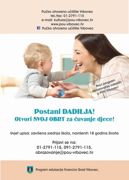 U tijeku su prijave za osposobljavanje za dadilje. Riječ je o novom programu obrazovanja odraslih u našem učilištu koji će polaznicama omogućiti otvaranje obrta za čuvanje djece ili zapošljavanje kod osoba koje imaju takav obrt. Dadilje mogu čuvati djecu do 14 godina u svom prostoru, u domu obitelji koja ih je angažirala ili mogu raditi za nekog drugoga, a kao pomoćno osoblje mogu raditi i u vrtićima. Program edukacije traje 400 sati, a uključuje predavanja vježbe ta prktičnu nastavu u trajanju od 150 sati koja see provodi u obrtu za čuvanje djece.