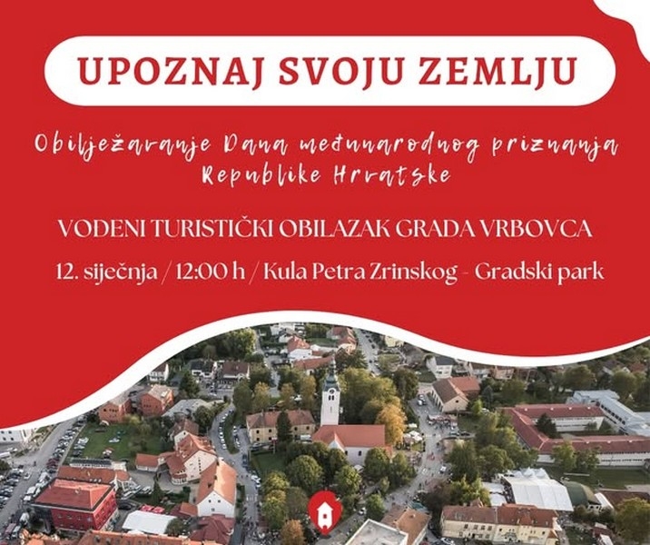 Upoznaj svoju zemlju naziv je projekta koji se provodi u sklopu obilježavanja Dana međunarodnog priznanja Republike Hrvatske, a uključuje besplatne vođene turističke ture gradovima diljem Hrvatske. Projekt je pokrenut na inicijativu Zajednice društava turističkih vodiča Hrvatske, a ove godine projektu se pridružio i grad Vrbovec. 😃 U nedjelju, 12. siječnja 2025. u 12:00 sati pridružite se turističkom obilasku užeg centra grada Vrbovca pod vodstvom turističke vodičice Sanje Prijatelj. Mjesto okupljanja bit će ispred Kule Petra Zrinskog u Gradskom parku. 😊