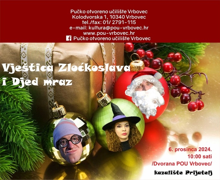 Uoči sv. Nikole u našoj dvorani pogledajte predstavu Vještica Zloćkoslava i djed Mraz 5. prosinca 2024. godine. U božićno vrijeme kao što svi vrlo dobro znamo Djed Mraz luta svijetom i razveseljava djecu pričom i poklonima. Ponekad malo zaluta, ode na krivi kontinent, ali na kraju uvijek uspije svima donijeti radost i veselje. Ovaj put, u našoj predstavi, naletjeti će na opasnog neprijatelja: Vješticu plemenitu Zloćkoslavu. Ona se ne zadovoljava jednim poklonom, ona hoće sve poklone koje Djed Mraz donosi dobroj djeci diljem svijeta!