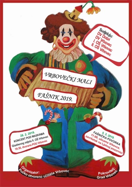Na Fašnik, u utorak, 5. ožujka 2019. od 11:00 sati održat će se Vrbovečki mali fašnik. U programu sudjeluje Dječji vrtić Vrbovec, Dječji vrtić Dobri te I. i II. osnovna škola Vrbovec. Svoju kreativnost predstavit će 23 maskirane skupine s 890 djece koja će u povorci proći ulicama grada Vrbovca. Povorka kreće od Ljetne pozornice ulicom Brdo do Poginulih branitelja pa do centra te dalje do ljetne pozornice. Prijavljene grupe su: Kule Petra Zrinskog, Kauboji i indijanci, Plamenovi, Revija šešira, Afričko pleme, Čudnotikoni, Magnetići, Navijači, Emotikoni, Preokrenuli smo svijet, Maslačci, Špagete, Godišnja doba, Zvjezdana noć, Prometni znakovi, Meksikanci, Osnovne boje, Sladoredari, Slikari, Smajlići, Anđeli i đavolčići, Priroda i Duplići.
