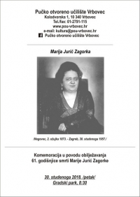 U povodu 61. godišnjice smrti Marije Jurić Zagorke, koja je preminula 30. studenoga 1957. godine u Zagrebu, Pučko otvoreno učilište Vrbovec organizira komemoraciju koja će se održati ispred Zagorkine biste u gradskom parku 30. studenoga 2018. godine u 8:00 sati i 30 minuta. Kraći povijesni osvrt na život i rad najčitanije hrvatske književnice i naše prve novinarke koja je rođena 1873. godine u Negovcu nedaleko Vrbovca dat će Sanja Prijatelj, ravnateljica Pučkog otvorenog učilišta Vrbovec.